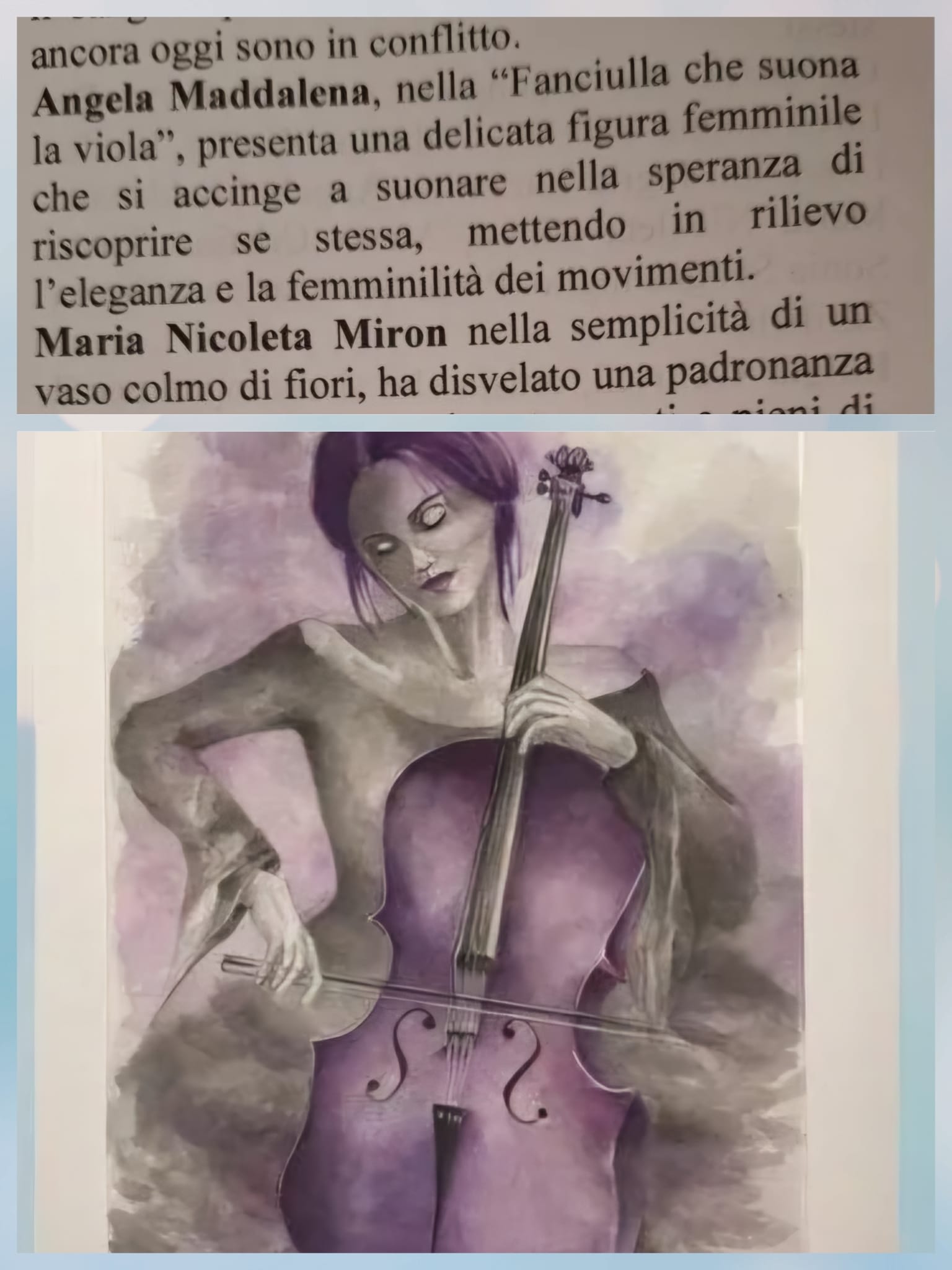 2. "La fanciulla che suona la viola": acquerello su carta 640g (55x75). Rappresenta una fanciulla che suona una Viola (uno strumento spesso sottovalutato rispetto al violino e al violoncello), mostrandosi in tutta la sua eleganza, riscoprendo sé stessa nella passione musicale e nella scelta di uno strumento meno diffuso, riscattando sé stessa e lo strumento stesso.